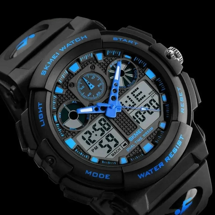 Introducing the SKMEI 1270 in an edition marked by an attractive color contrast combining strength and vitality. This model maintains the robust black case and durable silicone strap but adds a distinctive touch with striking blue hands that stand out clearly against the dark dial background and digital screens.