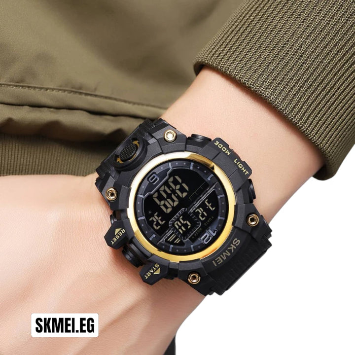 الهيكل مصنوع من مزيج متين من بلاستيك ABS و TPU المرن، وهو مصمم لامتصاص الصدمات وتحمل أقسى الظروف. الشاشة الرقمية الكبيرة والواضحة توفر لك جميع الوظائف التي تحتاجها، من التوقيت المزدوج وساعة الإيقاف إلى المنبه والتقويم. مع سوار مريح من مادة TPU، فإن هذه الساعة جاهزة لمرافقتك في كل مغامراتك.